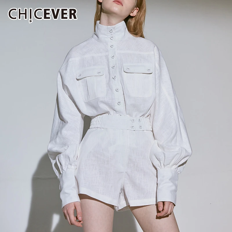 incredible CHICEVER White Shirt Shorts Women Two Piece Sets Lantern Sleeve Blouse Female High Waist Shorts Sui