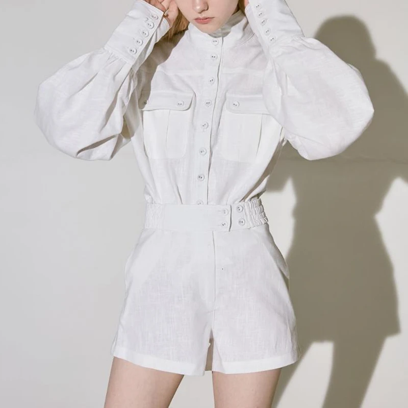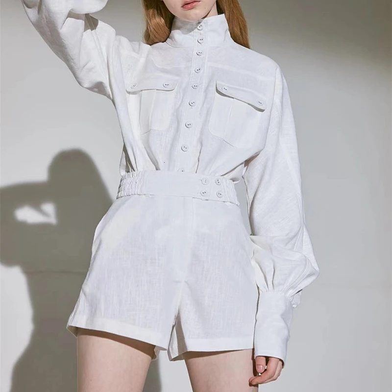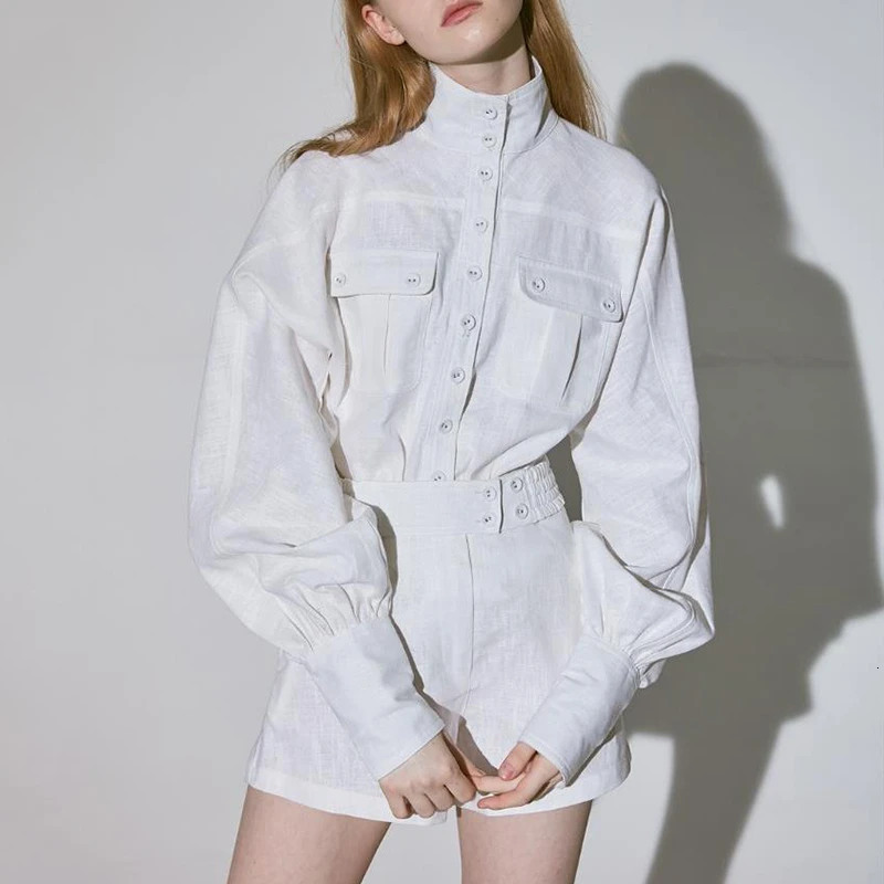 discounted CHICEVER White Shirt Shorts Women Two Piece Sets Lantern Sleeve Blouse Female High Waist Shorts Sui