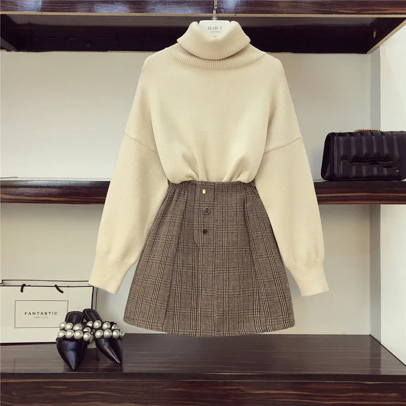 Knit Solid Long Sleeve Turtleneck Jumper Sweaters Tops+Tweed Plaid High Waist Mini Skirts Women Fashion Office Work Autumn Sets,Sweet plaid 2 piece skirt set girl Korean style tops and skirt set S-XL two piece outfits 2019 winter women 2 piece set, Sweet plaid 2 piece skirt set girl Korean style tops and skirt set S-XL two piece outfits 2019 winter women 2 piece set