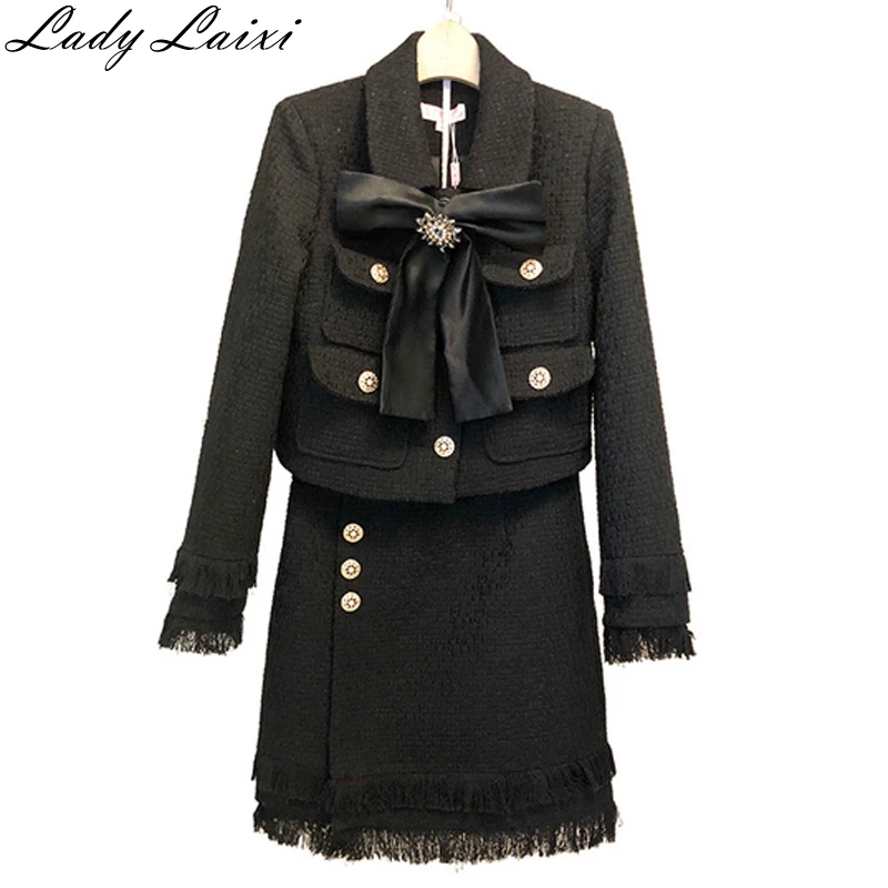 Promo Runway Tweed Wool Skirt Suit 2019 Autumn Winter 2 Piece Set Women Diamonds Bow Button Short Jacket