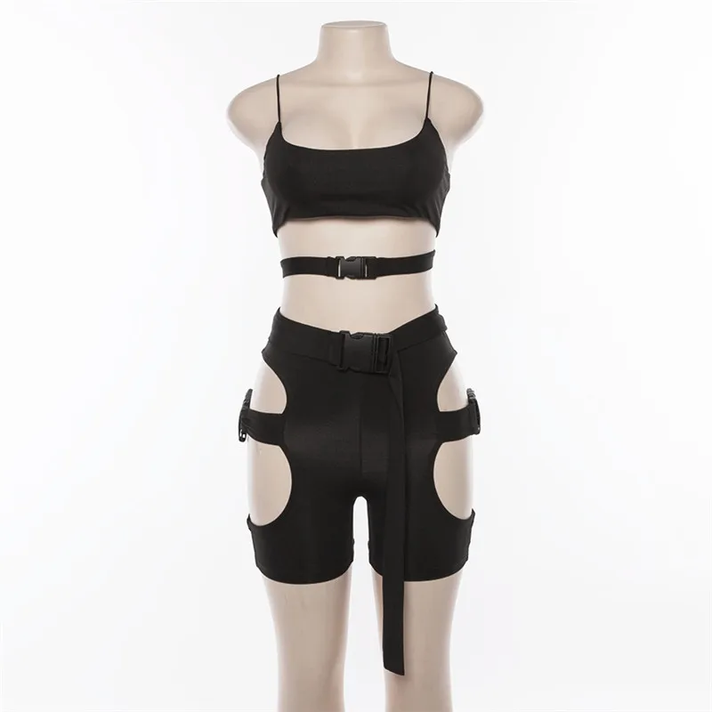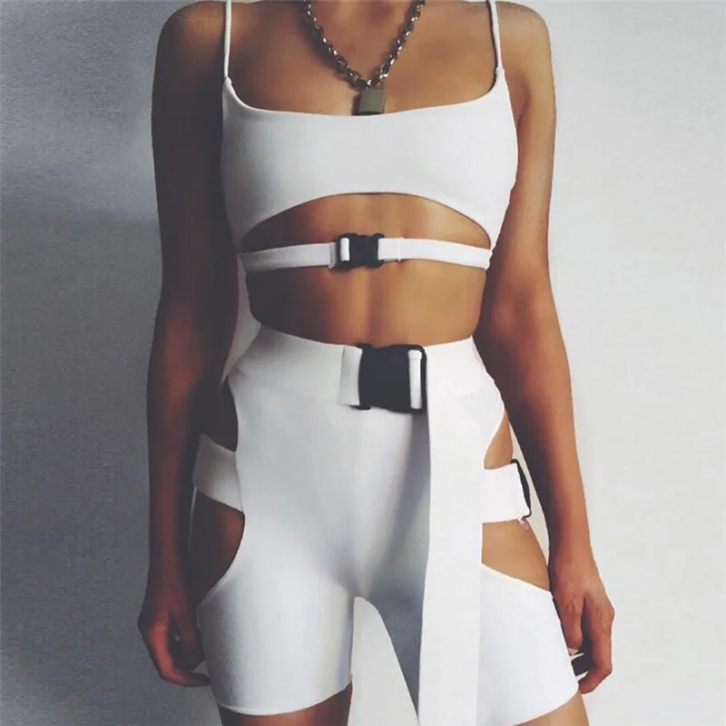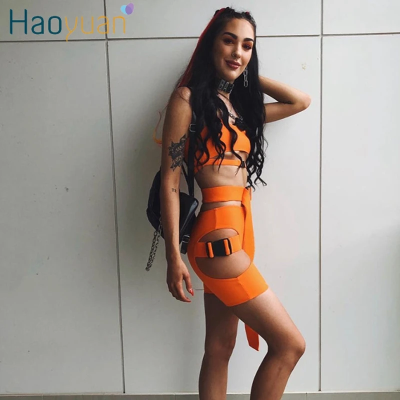 Promo HAOYUAN Neon Green Two Piece Set Tracksuit Women Summer Top and Biker Shorts Rave Festival Sexy Clu